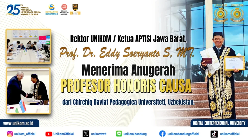 Sivitas akademika Universitas Komputer Indonesia (UNIKOM) mengucapkan selamat dan sukses kepada Prof. Dr. Ir. H. Eddy Soeryanto Soegoto, M.T., Rektor UNIKOM sekaligus Ketua APTISI Jawa Barat, atas penganugerahan Profesor Honoris Causa dari Chirchiq Davlat Pedagogica Universiteti, Uzbekistan.